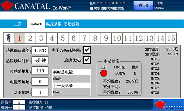該系統(tǒng)通過為每個空調對應區(qū)域都增設了網絡型溫濕度傳感器節(jié)點(每節(jié)點10通道),以采集機房整體溫度場數(shù)據。集控系統(tǒng)根據采集的數(shù)據對整個機房的空調設備參數(shù),溫度場分布進行綜合運算分析,整體調度機房內所有空調的運行,均衡控制機房溫度場,提高整體運行效率,達到節(jié)能目的。