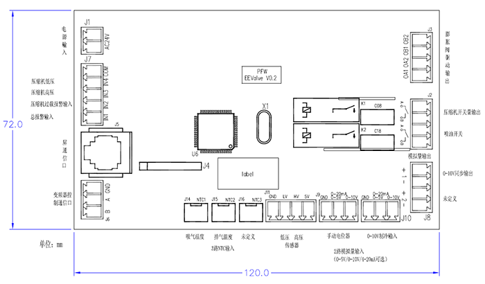 - 內(nèi)置1路2相4線步進(jìn)電機(jī)(24V/Max.1.5A)萬能電子膨脹閥控制器;2路12V,5線電子膨脹閥控制器。